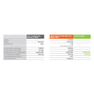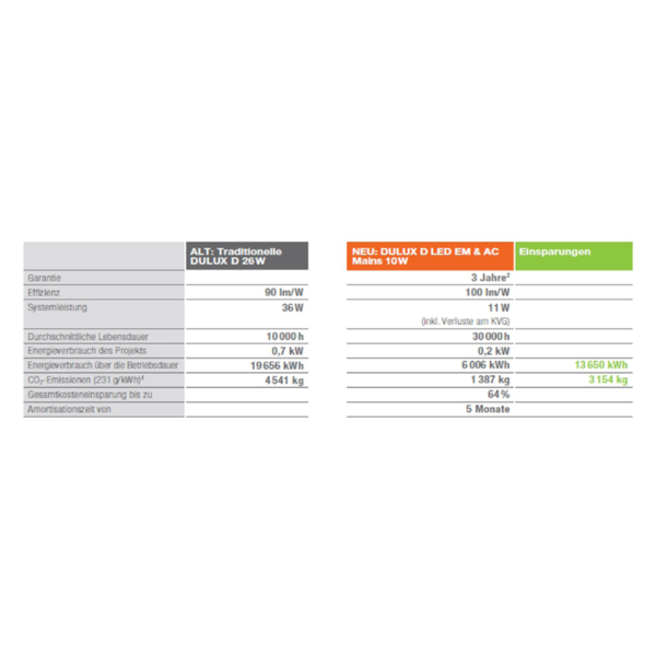 Die LEDVANCE DULUX® LED können mit ihrer sofortigen Energieeinsparung die Betriebskosten senken. Und das übrigens gleich zweifach: Ihre lange Lebensdauer von 30.000 Stunden steigert die Wirtschaftlichkeit weiter und sorgt zudem für eine schnelle Amortisation der Wechselkosten.